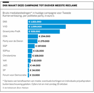 Ruim twee miljoen euro gaf D66 uit aan reclamecampagnes in de aanloop naar de Tweede Kamer verkiezingen.