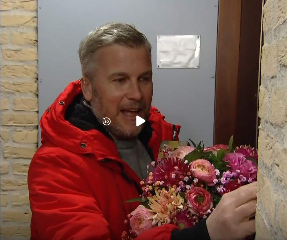 Maar nog geen drie weken later, zondag 30 maart, loopt ie zwaar hijgend vol in ’t licht de trap op naar de eerste (!) etage van een flatgebouw, enthousiast lullend tegen de camera- en geluidsman, lichttechnicus, visagist, personal coach en god mag weten wat er allemaal nog in het gevolg zit, en belt aan bij een voordeur met een cheque van 135.000 euro (dat weten wij, maar Winston houdt de spanning erin).